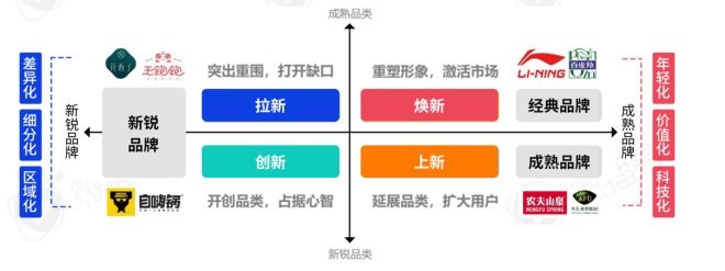 《報(bào)告》中總結(jié)出了“拉新、煥新、創(chuàng)新、上新”四個(gè)基于產(chǎn)品的新消費(fèi)品牌發(fā)展路徑:新銳品牌以差異化、細(xì)分化和區(qū)域化策略在成熟品類和新銳品類中雙雙崛起;而經(jīng)典成熟的品牌則通過年輕化、價(jià)值化、科技化激活市場,擴(kuò)大用戶群。新銳品牌在成熟品類中突圍拉新,或開創(chuàng)全新類目,占據(jù)用戶心智;而經(jīng)典成熟的品牌則在成熟品類中重塑形象煥新,或在新品類中延展上新。