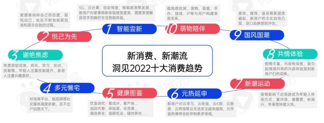 通過對四大新消費(fèi)增量人群的消費(fèi)偏好分析,《報(bào)告》中總結(jié)出了2022年的十大新消費(fèi)趨勢,包括智能嘗新、悅己為先、謝絕焦慮、多元懶宅、健康圖鑒、元熱延申、新潮運(yùn)動(dòng)、共情體驗(yàn)、國風(fēng)國潮、萌物陪伴。