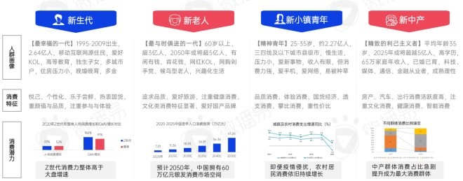 根據(jù)《報(bào)告》分析,中國新消費(fèi)行業(yè)有著四個(gè)典型的增量用戶畫像,分別為:新生代、新老人、新小鎮(zhèn)青年、新中產(chǎn),這四大群體消費(fèi)需求各異,但在過去數(shù)年中展現(xiàn)了強(qiáng)勁的增長速度,持續(xù)激發(fā)消費(fèi)市場的新活力。