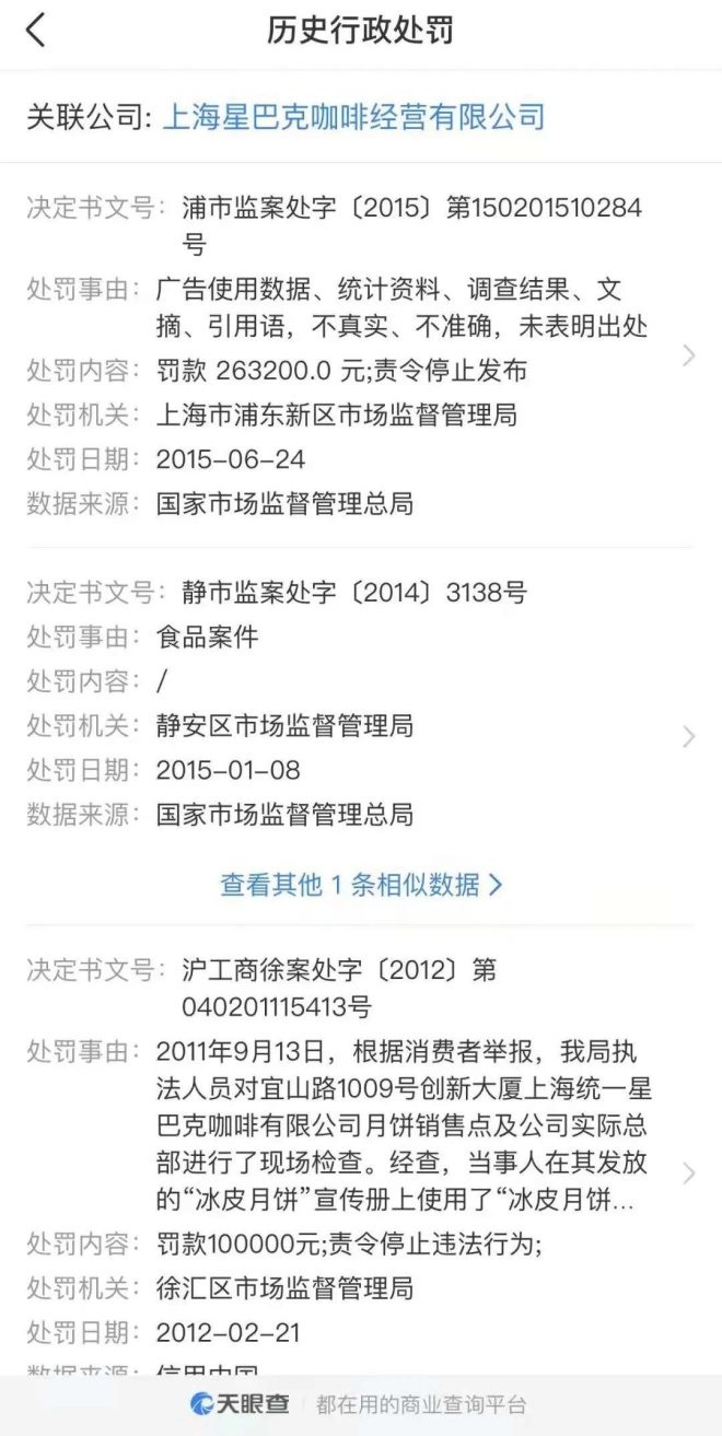 根據(jù)公開報(bào)道顯示,星巴克屬于直營模式加上內(nèi)審制度,直營模式下出現(xiàn)質(zhì)量問題,說明品牌管理存在明顯漏洞,公司難辭其咎。與此同時(shí),鰲頭財(cái)經(jīng)梳理公開資料發(fā)現(xiàn),此前星巴克也多次因食品安全違法行為被處罰。工商信息數(shù)據(jù)顯示,今年上海徐匯區(qū)、靜安區(qū)市場監(jiān)管局,深圳市場監(jiān)管局鹽田監(jiān)管局,分別對當(dāng)?shù)匦前涂说赀M(jìn)行行政處罰,原因多為其食品安全違法行為。
