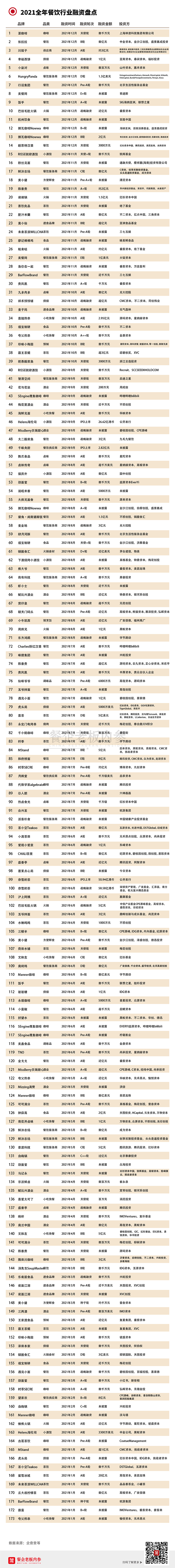 內(nèi)參君整理了2021全年餐飲行業(yè)的投融資數(shù)據(jù)(不完全統(tǒng)計),共計173起。如果說上半年融資熱涌向高潮,那么現(xiàn)在就是資本和餐企的穩(wěn)定發(fā)展期。