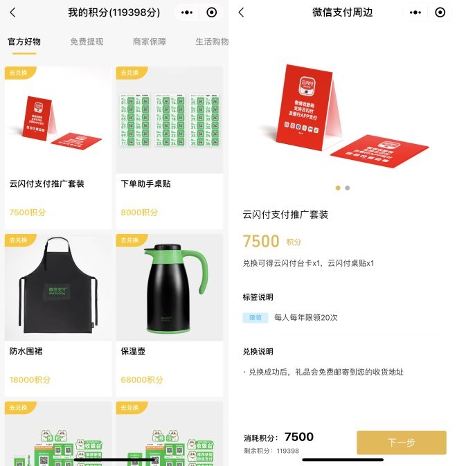商家可在“收款小賬本”微信小程序,進(jìn)入“我的積分”頁(yè)面,使用積分兌換“云閃付支付推廣套裝”,此外購(gòu)買(mǎi)“微信官方收款碼”也可同時(shí)獲取云閃付相關(guān)物料。