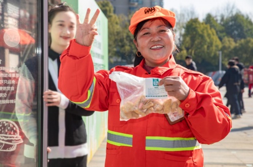 來自杭州濱江區(qū)浦沿街道的牛阿姨是附近的一名環(huán)衛(wèi)工人,今天她第一個領(lǐng)到了余量食物,“這種方式挺好的,科學(xué)利用,減少浪費。這一份我?guī)Щ厝,中午給外孫熱來吃”。