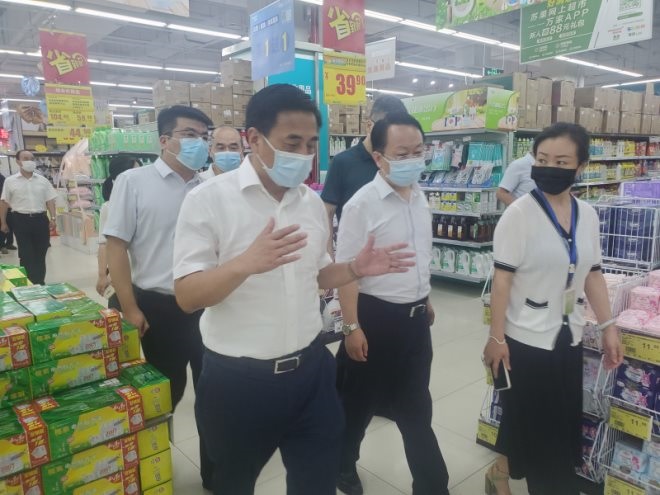 8月24日,儀征市代市長李林市,商務(wù)局、市場監(jiān)督局等部門分管負(fù)責(zé)人一行蒞臨華潤蘇果儀征工農(nóng)南路店檢查疫情防控工作及民生保供情況。
