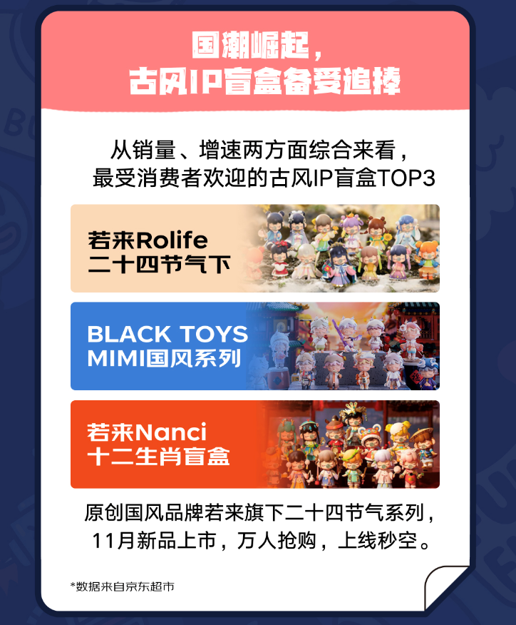 此外,若來Rolife二十四節(jié)氣下盲盒Nanci秋收冬藏、BLACK TOYS MIMI國風(fēng)系列盲盒也受到用戶的歡迎,新老IP同臺競技為消費者提供了更多選擇。