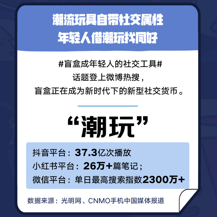 同時,作為快速崛起的新賽道,潮玩不斷破圈,已經(jīng)成為大眾關(guān)心的熱門話題。#盲盒成年輕人的社交工具#話題登上微博熱搜,可見其正在成為新時代下的新型社交貨幣。