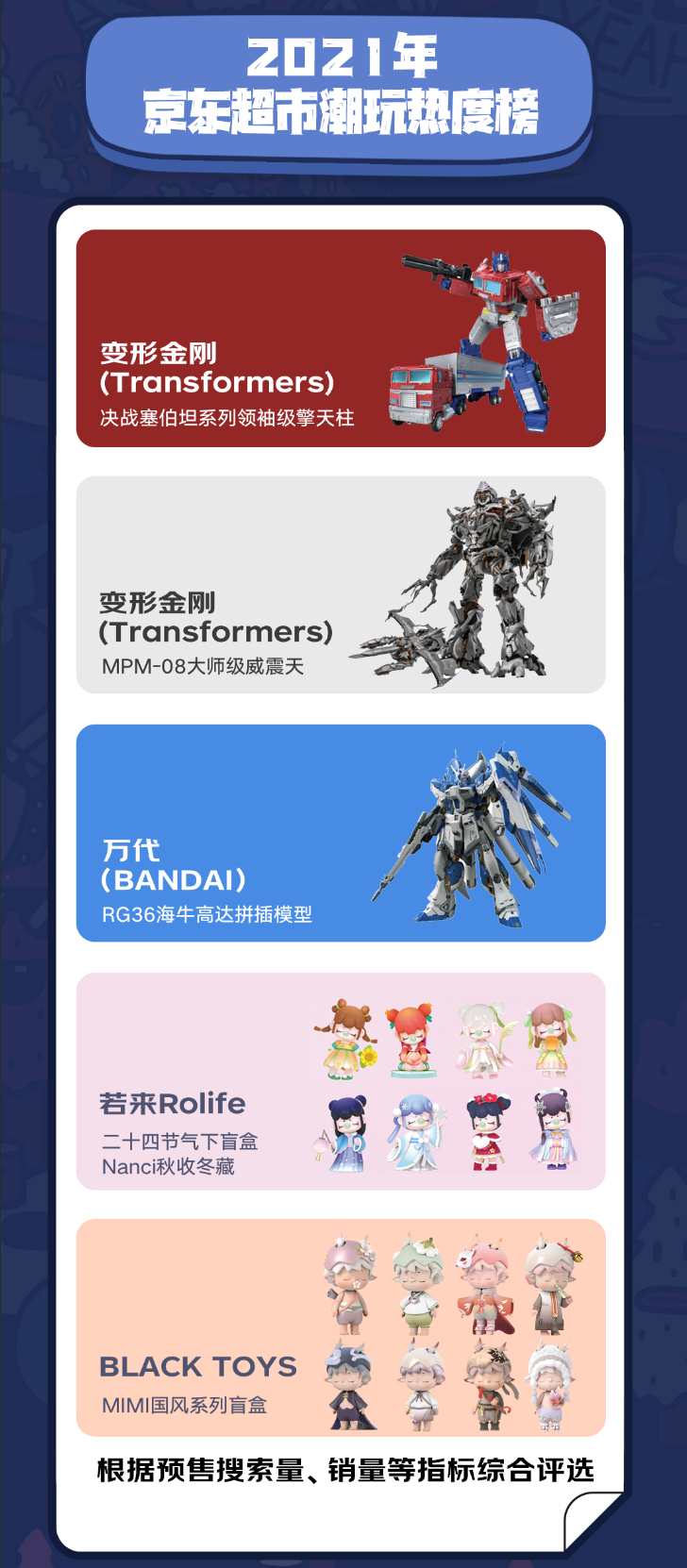 不僅對即將上線的新款充滿了期待,玩家們對經(jīng)典IP也是如數(shù)家珍。京東數(shù)據(jù)顯示,2021年京東超市潮玩熱度榜中,前三位的變形金剛、高達等均是我們耳熟能詳?shù)慕?jīng)典IP。
