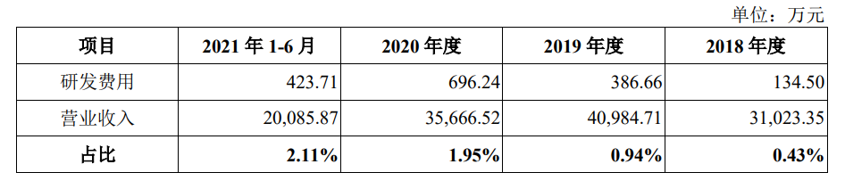 此外,幺麻子的研發(fā)投入并不高。招股書顯示,2018年至2020年,幺麻子的研發(fā)投入分別134.50萬元、386.66萬元、696.24萬元以及423.71萬元,占營收比例為0.43%、0.94%、1.95%以及2.11%,期間可比公司研發(fā)費(fèi)用率的平均值分別為2.02%、2.33%、2.49%、2.51%。
