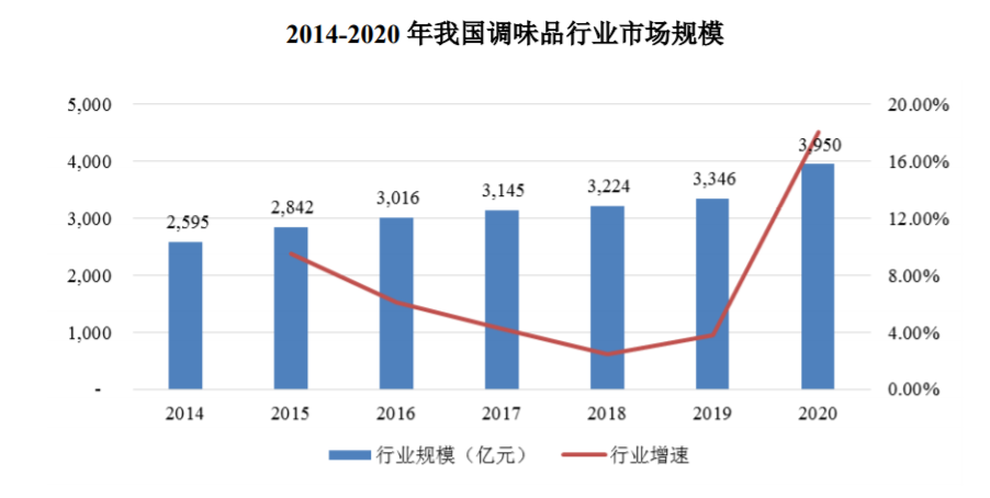 而成立時間更長的老品牌,如黔老翁曬醋、川娃子食品等,也同樣在2021年12月拿下融資。其中,川娃子完成高榕資本領(lǐng)投的近3億元A輪融資。根據(jù)艾媒咨詢數(shù)據(jù),2014-2020年,我國調(diào)味品行業(yè)市場規(guī)模從2,595億元增長至3,950億元;2020年,我國調(diào)味品行業(yè)市場規(guī)模同比增長18.05%。