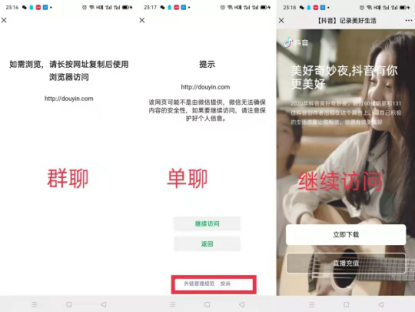 在“最后期限”9月17日當(dāng)天,微信更新了新的外鏈規(guī)范。但經(jīng)過實(shí)測(cè)發(fā)現(xiàn),復(fù)制抖音視頻鏈接發(fā)送到微信,會(huì)出現(xiàn)“繼續(xù)訪問”選項(xiàng),點(diǎn)擊后打開的是抖音APP下載鏈接。天貓、淘寶等APP鏈接則仍連”繼續(xù)訪問”選項(xiàng)都沒有,還需要自行復(fù)制到瀏覽器打開。