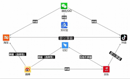 微信無法直接訪問淘寶鏈接,而要借助火星文一般的“淘口令”;淘寶購物付款,不能使用微信支付;抖音向用戶發(fā)站內(nèi)通知,禁止向微信、QQ引流……