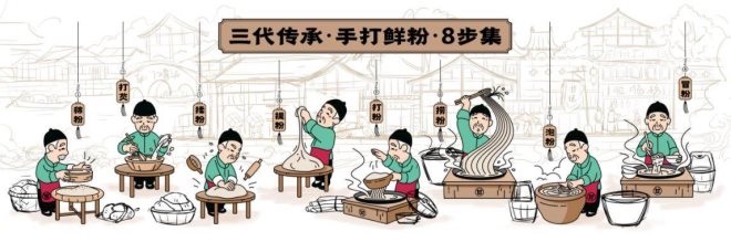 對于連鎖餐飲品牌來說,首先需要實現(xiàn)的就是標準化問題,否則很難大規(guī)模擴張。通過十年的傳承與創(chuàng)新,甘樂在器皿和工藝上 開創(chuàng)了可復(fù)制的標準化系統(tǒng):首先,在打粉器皿上,將祖輩的27子鋁粉瓢改良為21孔紫銅粉瓢;其次, 在手打紅薯鮮粉技術(shù)上,將曾經(jīng)只能言傳身教的傳統(tǒng)技藝流程梳理為《手打紅薯鮮粉八步集》,便于以標準可量化的科學(xué)方式,使這門傳統(tǒng)手工藝教給更多的打粉師傅,現(xiàn)在,手工制粉師傅經(jīng)過一周培訓(xùn)就能進行獨立操作。