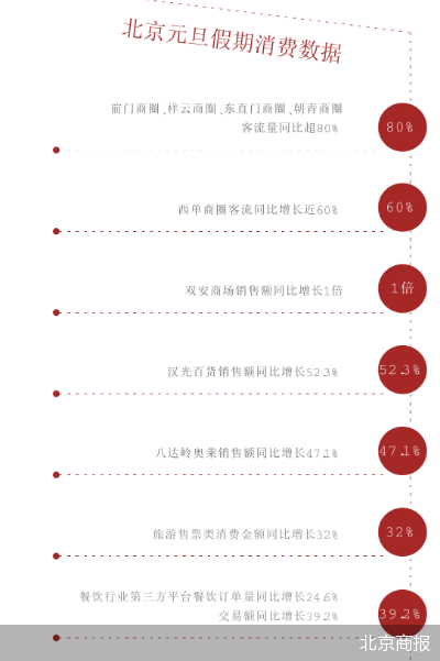 1月3日,北京市商務局發(fā)布的元旦假日消費數(shù)據(jù)顯示,重點監(jiān)測的各業(yè)態(tài)企業(yè)實現(xiàn)銷售額38.9億元,同比增長18.8%。全市52個重點商圈客流量超1600萬人次,同比增長35%。