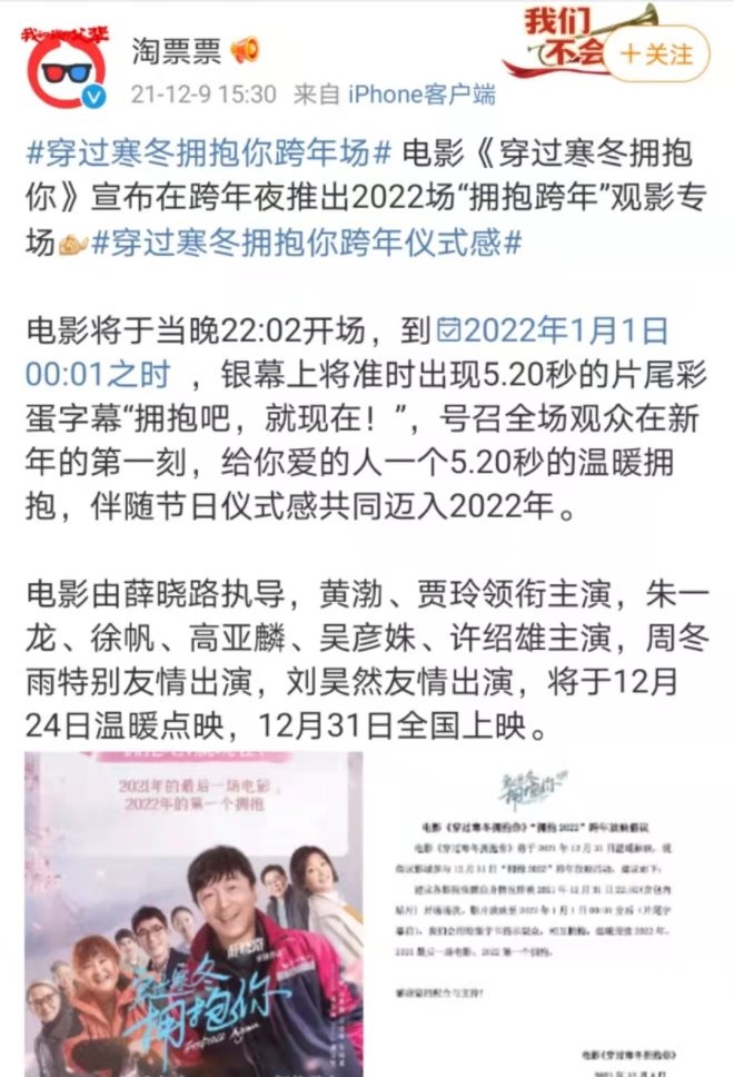 而《穿過(guò)寒冬擁抱你》本身是以抗疫為背景的電影,通常在元旦這種“合家歡”的檔期內(nèi)難以實(shí)現(xiàn)“大爆”。所以,影片借鑒了《地球最后的夜晚》“0點(diǎn)跨年”的宣發(fā)手段,將宣傳重點(diǎn)放在了“2021年最后一天看《穿過(guò)寒冬擁抱你》,在電影結(jié)束的時(shí)候擁抱對(duì)方”的儀式感上。