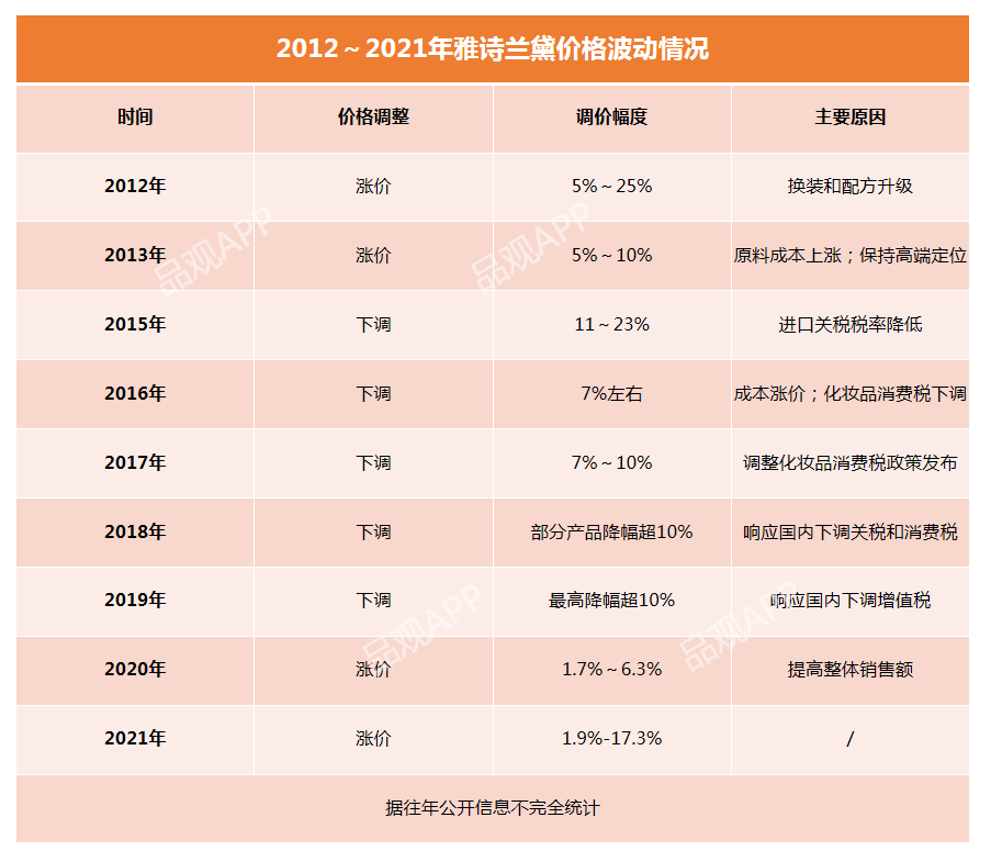 化妝品觀察據(jù)公開信息不完全統(tǒng)計(jì),自2012年起,雅詩(shī)蘭黛已至少經(jīng)歷10次價(jià)格調(diào)整。