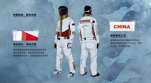 設計方面,條紋圖案象征滑雪跳躍的軌道和渴望勝利的快節(jié)奏,多處細節(jié)處采用細密橫條紋設計,凸顯競技感與速度感。使用國旗紅搭配五角星金色的設計,結(jié)合精致肌理繡花工藝,縫制代表國家隊的“CHINA”字樣,展現(xiàn)自豪感。套裝備以遠超于行業(yè)常規(guī)面料的水準滿足專業(yè)運動員所需的備賽需求。