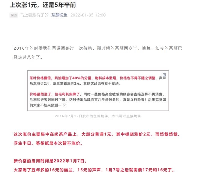 聯(lián)商快訊:1月5日中午,茶顏悅色官方微信公眾號(hào)宣布漲價(jià),這次漲價(jià)主要集中在奶茶產(chǎn)品上,大部分普調(diào)1元。