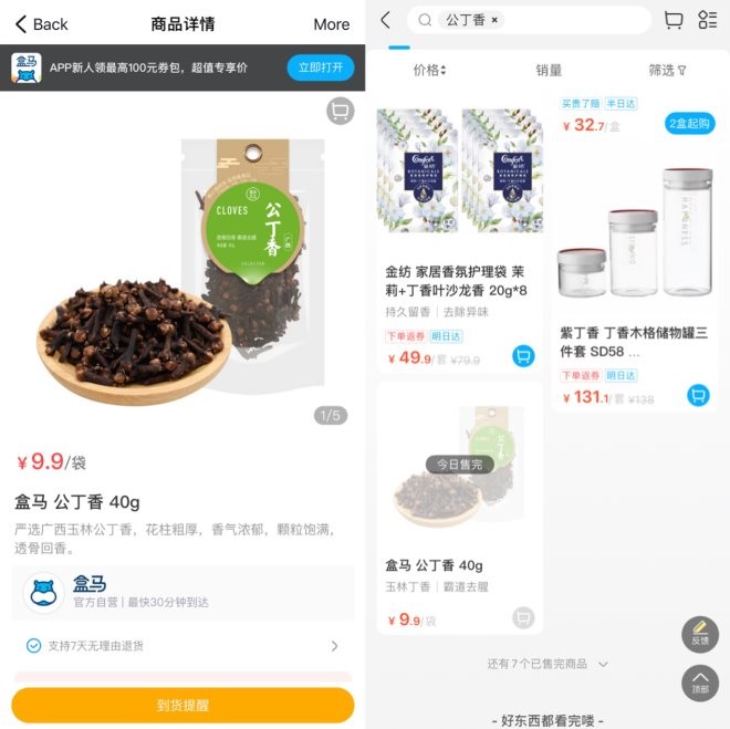 以“盒馬牌”公丁香為例,其平時使用場景不如八角、桂皮和香葉來得多,常用于制作鹵菜、川味火鍋,香味濃烈,祛腥增香。在傳統(tǒng)熱紅酒的料理中,公丁香用來插在橙子上煮。因此隨著熱紅酒的流行,公丁香的銷量也隨之大漲,加上今年熱度遠超往年,一些門店很快就售罄了,盒馬的采購迅速調(diào)撥補貨。