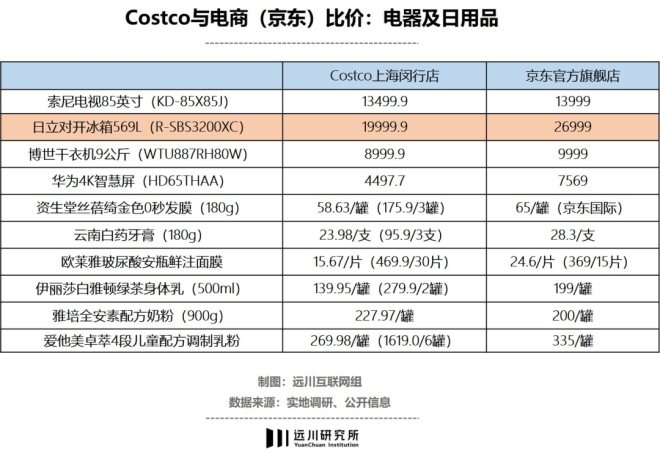 據(jù)東吳證券測算,盡管有店租和工資,但Costco的流通效率甚至比京東這種電商平臺還高[5]。從下面比價(jià)圖可知,在Costco有限的電器類SKU中,大多比電商渠道還要便宜,像日立的雙開門大冰箱,比京東便宜了將近7000塊;而在日用品領(lǐng)域,Costco大包裝平攤下來的單位價(jià)格也大多比京東便宜。
