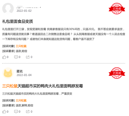 在黑貓投訴平臺上,截至1月5日發(fā)稿,有關(guān)三只松鼠的投訴共計1732條,且大多數(shù)問題集中在發(fā)霉、變質(zhì)、吃出各種異物(生蛆、毛發(fā)、塑料制品、蟲子)、水果罐頭生蟲、巖燒土司發(fā)綠等。