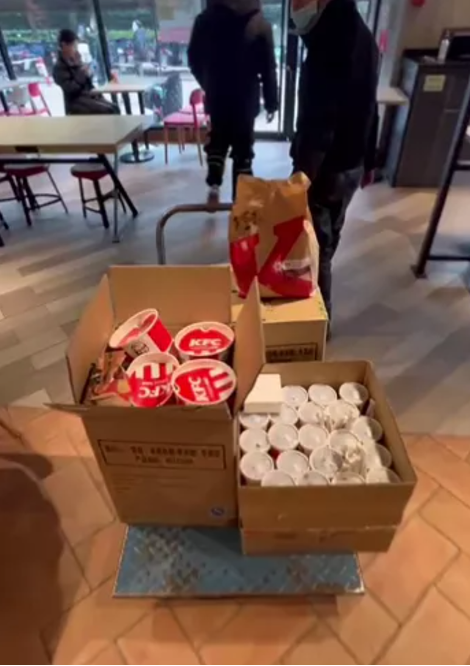 這種整盒購(gòu)買的情況,被稱為“連盒端”。多數(shù)潮玩玩家,為了集齊一整套,都會(huì)選擇連買6份。于是,不少網(wǎng)友實(shí)現(xiàn)了“肯德基自由”,有人分享了自家冰箱被肯德基塞滿的場(chǎng)景,有人拎著18杯可樂(lè)被保安當(dāng)成了外賣小哥,有玩家則曬出用推車采購(gòu)的圖片……