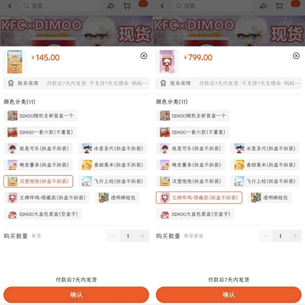 泡泡瑪特走的就是積木熊的老路,只不過(guò)除了聯(lián)名,它也想打造自己的IP。這次和肯德基聯(lián)名的,就是泡泡瑪特旗下的Dimoo系列。泡泡瑪特也拿捏了獨(dú)特的重要性,限量發(fā)售,多數(shù)門店當(dāng)天就賣光。官方宣布總共發(fā)售263880份,按照肯德基在中國(guó)的門店數(shù)量7600余家來(lái)計(jì)算,每家店分到的盲盒不到35個(gè)。而大量盲盒流入淘寶、得物、閑魚等二級(jí)市場(chǎng),價(jià)格水漲船高,這也無(wú)形當(dāng)中為這次聯(lián)名活動(dòng)做了宣傳。