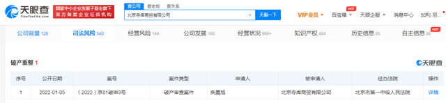 天眼查APP顯示,1月5日,北京寺庫(kù)商貿(mào)有限公司新增破產(chǎn)審查案件,申請(qǐng)人為柴晨旭,經(jīng)辦法院為北京市第一中級(jí)人民法院。北京寺庫(kù)商貿(mào)有限公司成立于2009年4月,法定代表人及疑似實(shí)際控制人為李日學(xué),注冊(cè)資本1000萬(wàn)人民幣。