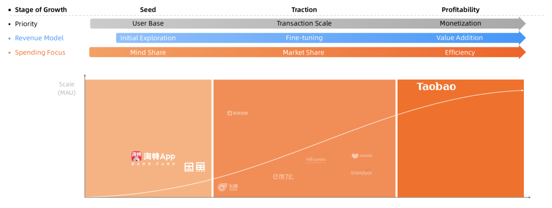 去年12月的阿里投資者大會上,阿里集團(tuán)副CFO徐宏將阿里各個業(yè)務(wù),分別劃到播種、壯大和盈利3個不同的發(fā)展階段。已經(jīng)處于成熟盈利階段的淘寶和天貓,需要考慮的是效率與效益的創(chuàng)新。