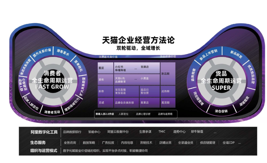 去年9月,天貓宣布自己成為一個D2C平臺,同時還推出了一套「企業(yè)經(jīng)營方法論」,提出“雙輪驅(qū)動”的概念:一個輪子是消費者生命周期價值管理(CLVM),另一個是貨品生命周期價值管理 (PLVM)。相當(dāng)于天貓梳理出了十億消費者的消費旅程,還抓住了品牌從商品研發(fā)到處理尾貨的生命周期,幫不同行業(yè)的商家讀懂人和貨的規(guī)律。