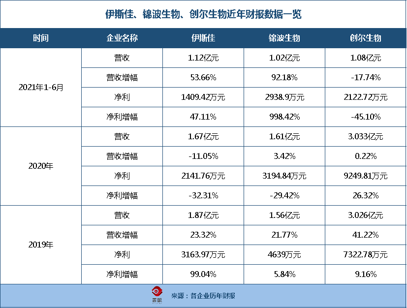 不過從全年的營收來看,在2019年和2020年中,創(chuàng)爾生物的營收和凈利則遠高于伊斯佳和錦波生物。而錦波生物則是3家企業(yè)中,唯一在2019年-2021年1-6月中,保持營收持續(xù)增長的企業(yè)。