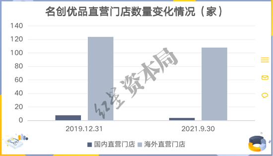 值得一提的是,門店總數在增加的同時,直營店數量卻不斷減少。截至2019年末,名創(chuàng)優(yōu)品在國內的2543家門店中,直營門店數量為8家;而截至2021年三季度末,國內總門店數量增至3031家,直營店僅剩下4家。