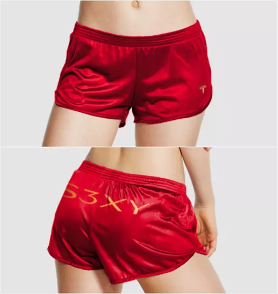 2020年,馬斯克將這款做空短褲重新設(shè)計,顏色改為紅色,更加醒目,面料從純棉升級為綢面,鑲上金邊,印上特斯拉LOGO和四款車型縮寫“S3XY”,在商店上架。