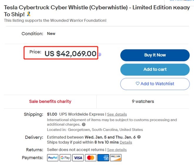 1月3日,特斯拉中國官網(wǎng)上架了一款Cyberwhistle限量款哨子,售價350元,由于外觀形似Cybertruck,一上架就被搶空了。