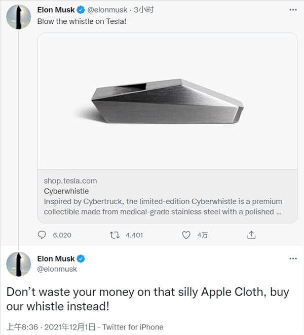 還有人調(diào)侃“特斯拉賽博哨國內(nèi)賣350元,吹出來的聲音穿透力是不是更強?”“馬斯克,你看我像智商欠費的樣子嗎?”,連如何搭配使用都想好了,“買個蘋果拋光布來擦特斯拉的哨子”。