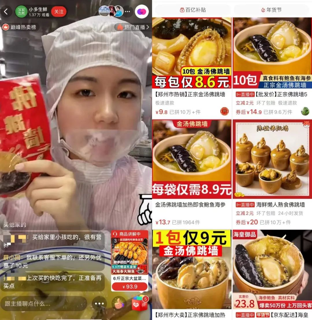 多看幾分鐘就能發(fā)現(xiàn),所謂直播不過是3分鐘的錄播視頻輪播,而均價不到20塊錢一袋的佛跳墻在拼多多上更是隨處可見,就算沒有直播間,產(chǎn)品賣到10萬+也很常見。
