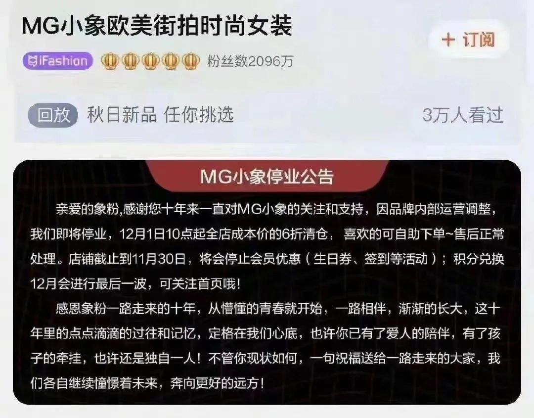 店鋪粉絲數(shù)高達(dá)2000多萬的MG小象宣布即將停業(yè)