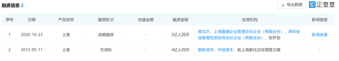 據(jù)企查查統(tǒng)計(jì),上美集團(tuán)僅有兩次融資。第一次在2015年5月,天使輪融資4億元,引入了聯(lián)新資本和中信資本,還有前上海家化總經(jīng)理葛文耀的個(gè)人投資。此次融資轟動(dòng)一時(shí),成為當(dāng)時(shí)本土化妝品領(lǐng)域最大的融資案例。