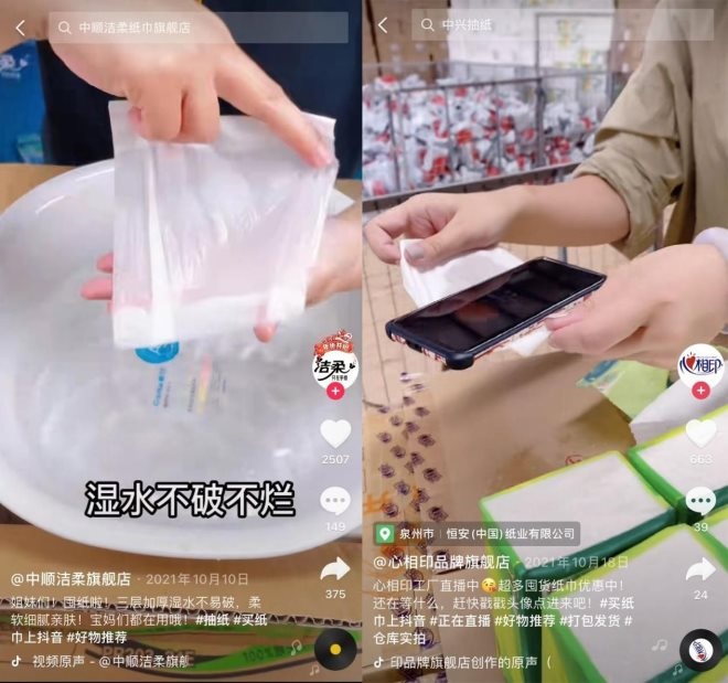 一抽一鋪,淋水,放上1至3部手機,雙手各執(zhí)一邊抬起,晃上幾晃,被浸透的紙巾也不會破和爛。不用主播開口介紹,觀眾便已迅速知曉視頻中的紙巾夠細膩、夠柔韌。
