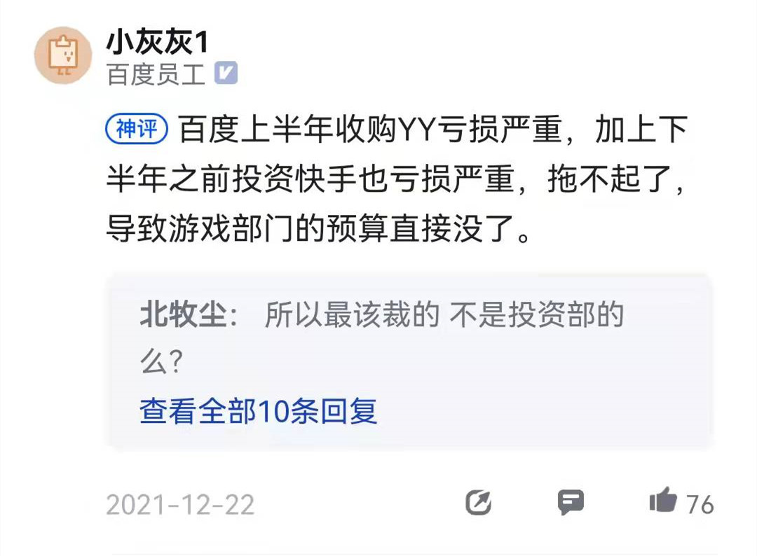 2021年末,百度傳出裁員消息。根據(jù)晚點LatePost、新浪科技、澎湃新聞等多家媒體報道,此次裁員主要集中在百度移動生態(tài)事業(yè)群(MEG),游戲是重災(zāi)區(qū)之一,部門300多人幾乎全部被裁,直播、教育業(yè)務(wù)也有不同比例裁員;被百度派去負責YY事業(yè)部的曹曉冬已經(jīng)不再擔任部門負責人。對此,百度官方暫未回應(yīng)。