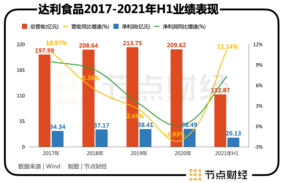 其實(shí),2021年上半年達(dá)利食品的業(yè)績表現(xiàn)還可以,扭轉(zhuǎn)了2020年的負(fù)增長頹勢。