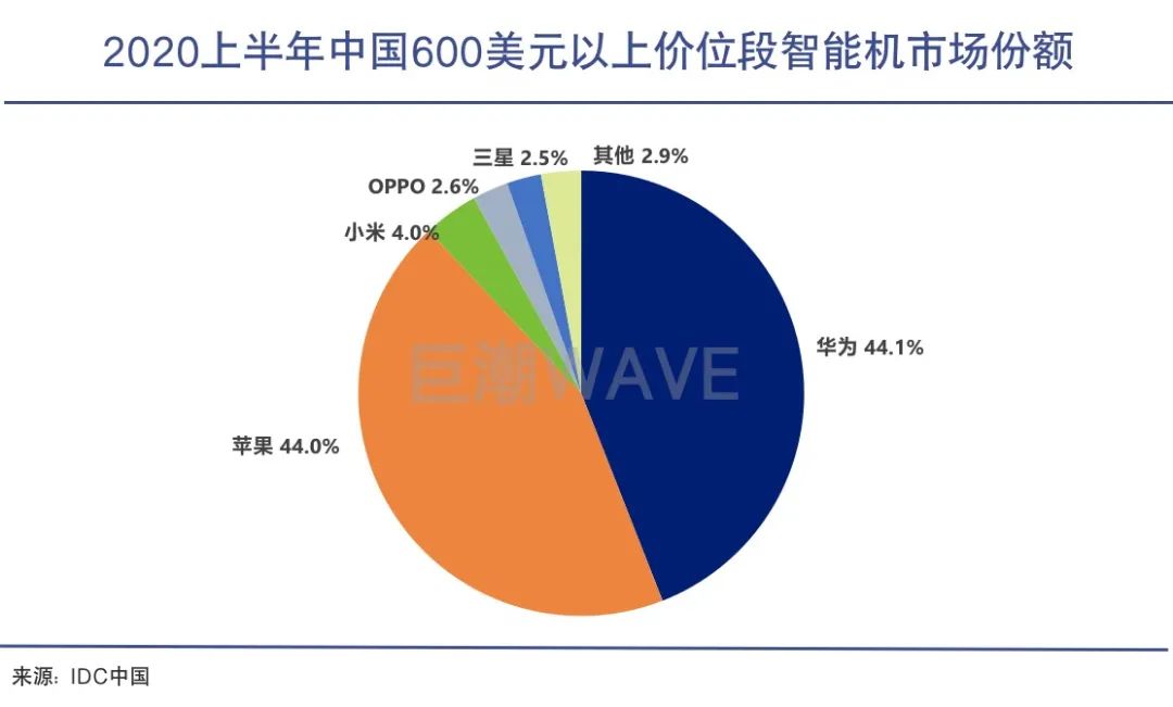 根據(jù)IDC的數(shù)據(jù),2020年上半年,國內(nèi)600美元以上價(jià)位段手機(jī)市場份額排名中,華為和蘋果兩個品牌占據(jù)了近九成的市場,達(dá)到了88.1%。華為以0.1%的優(yōu)勢領(lǐng)先蘋果位居第一。