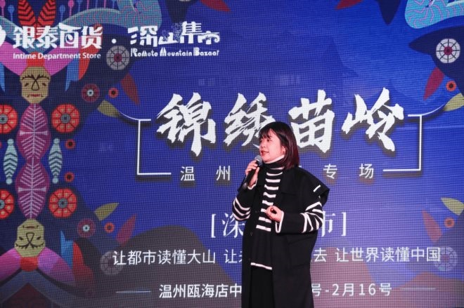 依文·中國手工坊副總裁劉文玲在開集儀式上致辭:“這是深山集市首次來到溫州,來到銀泰百貨。在這里,我們真切感受到了您們的溫暖和熱情。在過去的十八年里,我們一直奔走在大山里,為深山手藝人努力前行,把中國傳統(tǒng)手工藝帶出大山、帶進都市,融合現(xiàn)代設(shè)計理念,對接時代時尚潮流,以全新的姿態(tài)向世界展現(xiàn)中國傳統(tǒng)手工之美。您們的每一次購買,都是對中國傳統(tǒng)手工藝的支持,也是對繡娘的鼓勵。這次,深山集市聯(lián)合銀泰百貨,在這一個多月時間里,為您們帶去一場有情懷、有誠意的手工美學(xué)之旅。未來,我們要攜手銀泰百貨,繼續(xù)和繡娘一起,將深山手作和現(xiàn)代美學(xué)有機結(jié)合在一起,依托有溫度、有情懷的商業(yè)模型,讓更多深山手藝人能夠依靠雙手改變命運,過上更好的生活。”