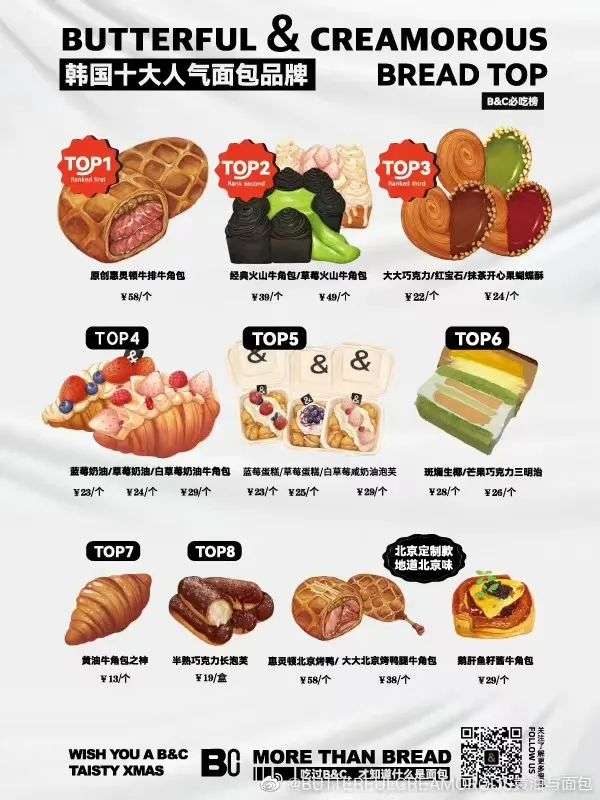 B&C面包的價(jià)格大多都在20-30元。最貴的兩款是明星產(chǎn)品,惠靈頓牛排牛角包,58元,草莓火山牛角包49元。