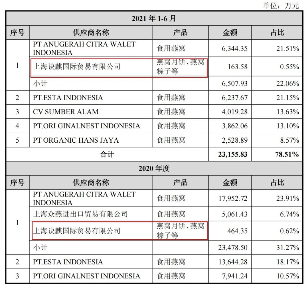 值得一提的是,燕之屋一直宣傳自己在燕窩產(chǎn)品的研發(fā)上有新的進(jìn)展,例如研發(fā)了燕窩的粽子、月餅等等。但在其招股書公布的采購(gòu)商名單中能看到,所謂其研發(fā)的燕窩粽子和月餅,實(shí)際上是由第三方生產(chǎn)、燕之屋貼牌銷售的。