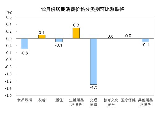 12月份,全國居民消費價格環(huán)比下降0.3%。其中,城市下降0.3%,農(nóng)村下降0.3%;食品價格下降0.6%,非食品價格下降0.2%;消費品價格下降0.4%,服務(wù)價格持平。