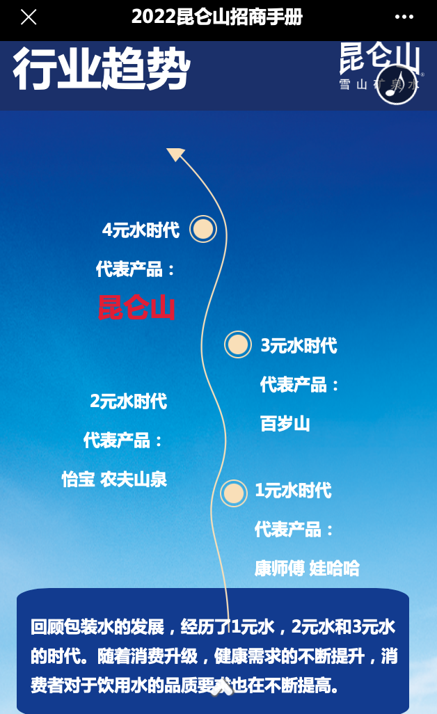 值得注意的是,昆侖山在招商手冊中將550ml礦泉水產(chǎn)品定價為4元——這也是昆侖山成立十余年來,官方少有的主動降低建議零售價。