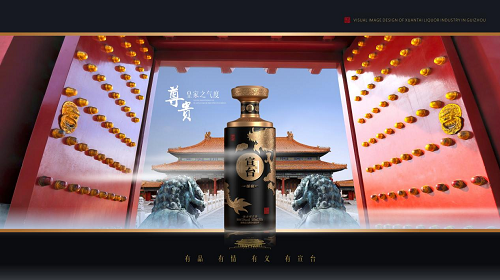 包裝設(shè)計(jì)里應(yīng)用“雙龍戲珠、鎏金寶頂、三和大殿、祥龍騰云、乾坤卷軸”等宮廷元素,讓整個(gè)酒瓶金碧輝煌,盡顯尊貴。