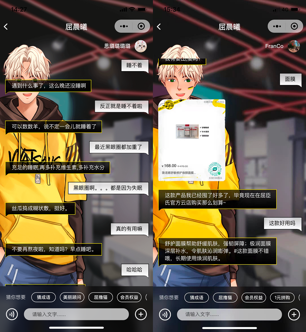 2019年7月,小冰公司與屈臣氏共同打造的屈臣氏首位虛擬偶像代言人“屈晨曦Wilson”正式出道。擁有帥氣外形的屈晨曦,不僅可以與消費者進行一對一的互動和對話,提供24小時的專業(yè)咨詢服務(wù),在一定場景下,還可以根據(jù)消費者的不同需求為其推薦相關(guān)產(chǎn)品。甚至可以和消費者進行“你畫我猜”、“猜成語”等有趣的互動游戲,頗受年輕消費者喜愛。