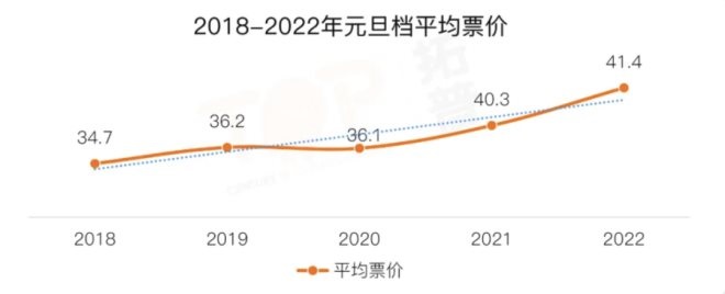 根據(jù)拓普數(shù)據(jù)統(tǒng)計,疫情之后,元旦檔平均票價大幅上漲過一次,由2020年的36.1元上漲到2021年的40.3元,漲幅達11.6%。2022年元旦檔平均票價達41.4元,相較于2021年的均價又增長了2.7%,再創(chuàng)新高。