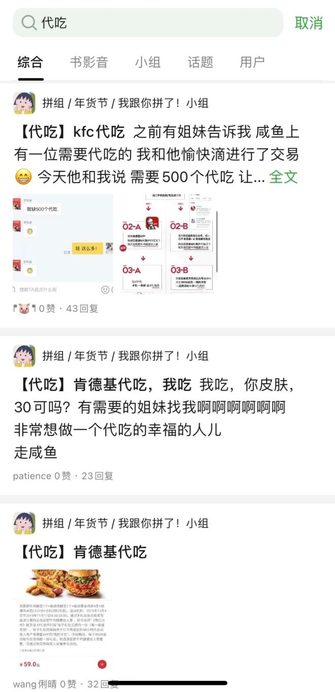 北窗還記得她第一次發(fā)布代吃貼的時(shí)候,留言里一下子涌入10多個(gè)需要代吃的留言,甚至開(kāi)始在帖子里競(jìng)價(jià)。供不應(yīng)求的背景下,很大程度上,負(fù)責(zé)代吃的一方更有“定價(jià)權(quán)”。曾經(jīng)有一次,因?yàn)槁?lián)名套餐里的主食不是漢堡,而是可頌,代吃們覺(jué)得有點(diǎn)“虧”,于是要求購(gòu)買(mǎi)代吃的人多付錢(qián)。